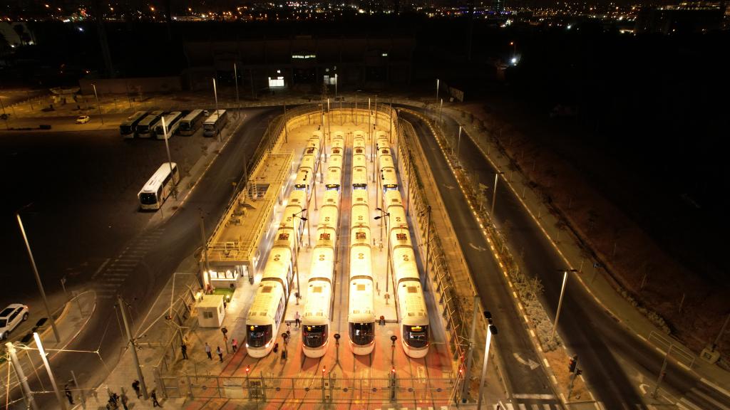 8月18日,在以色列特拉维夫以南的巴特亚姆,轻轨列车停放在泊车点,治装待发(无东谈主机相片)。(新华社发)