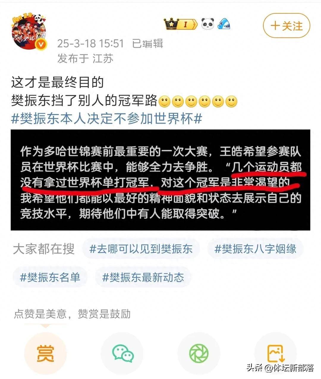 3月18日,中国乒乓球队公布2025年澳门寰球杯参赛名单,奥运冠军樊振东随机落第的音讯骤然引爆收罗。有自媒体爆料称“樊振东为王楚钦夺冠让开”,更直指国乒存在“潜步调”,这场风云背后究竟藏着什么奥妙?记者多方求证,试图规复事件全貌。